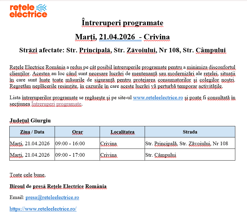 Rețele Electrice România a redus pe cât posibil întreruperile programate pentru a minimiza disconfortul clienților. Acestea au loc când sunt necesare lucrări de mentenanță sau modernizări ale rețelei, situații în care sunt luate toate măsurile de siguranță pentru protejarea consumatorilor și colegilor noștri. Regretăm neplăcerile resimțite, în cazurile în care aceste lucrări vă perturbă temporar activitățile.