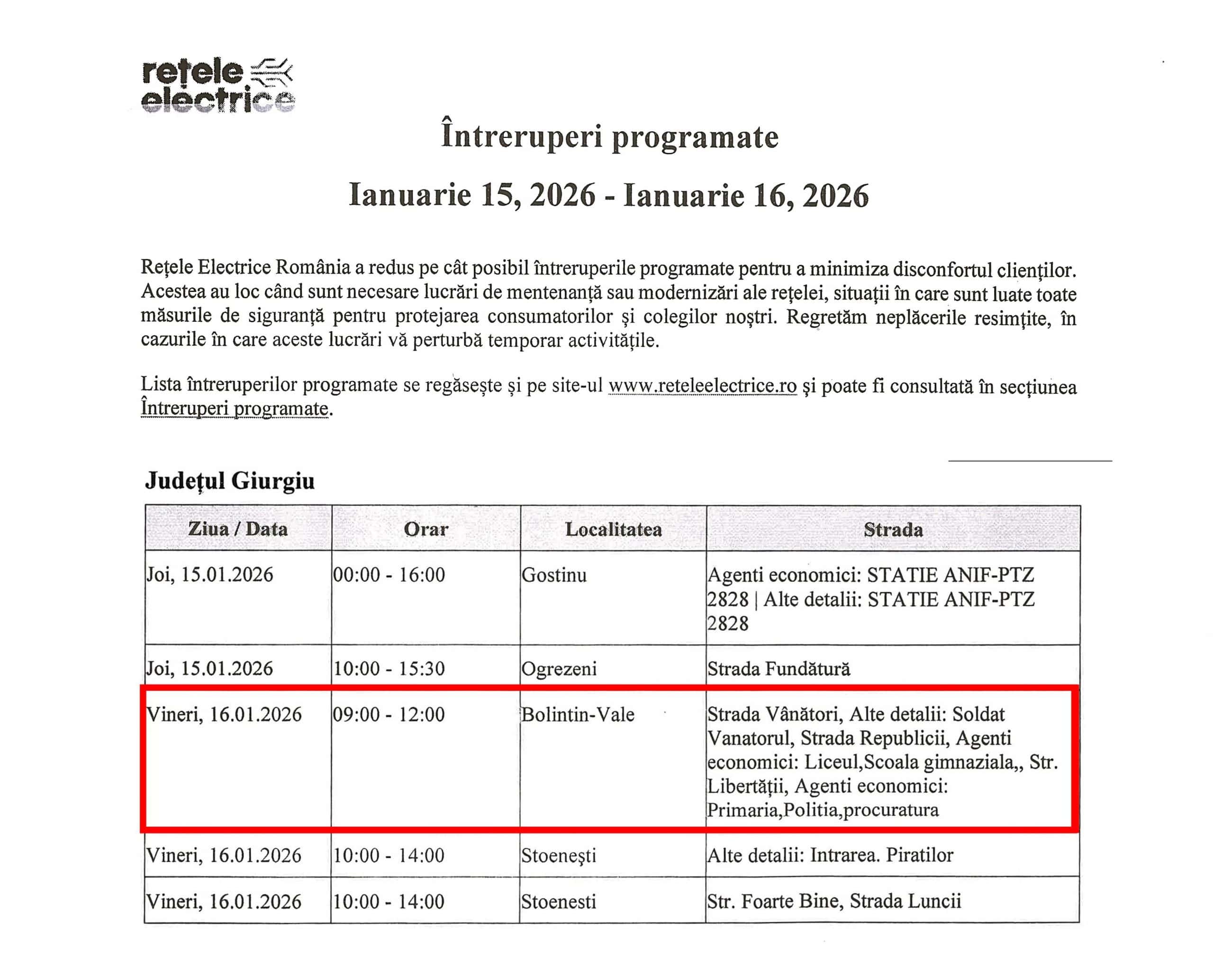 Se întrerupe alimentarea cu energie electrică – vineri, 16.01.2026, în intrervalul orar 09:00-12:00.